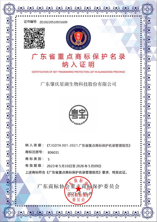 2023年5月10日,正值中國第七個(gè)品牌日之際,2022年度廣東省重點(diǎn)商標(biāo)保護(hù)名錄正式發(fā)布,星湖科技品牌商標(biāo)“星湖”和“粵寶”納入《廣東重點(diǎn)商標(biāo)保護(hù)名錄》,這是對星湖科技品牌價(jià)值和市場地位的高度認(rèn)可,彰顯了品牌實(shí)力和市場價(jià)值。
